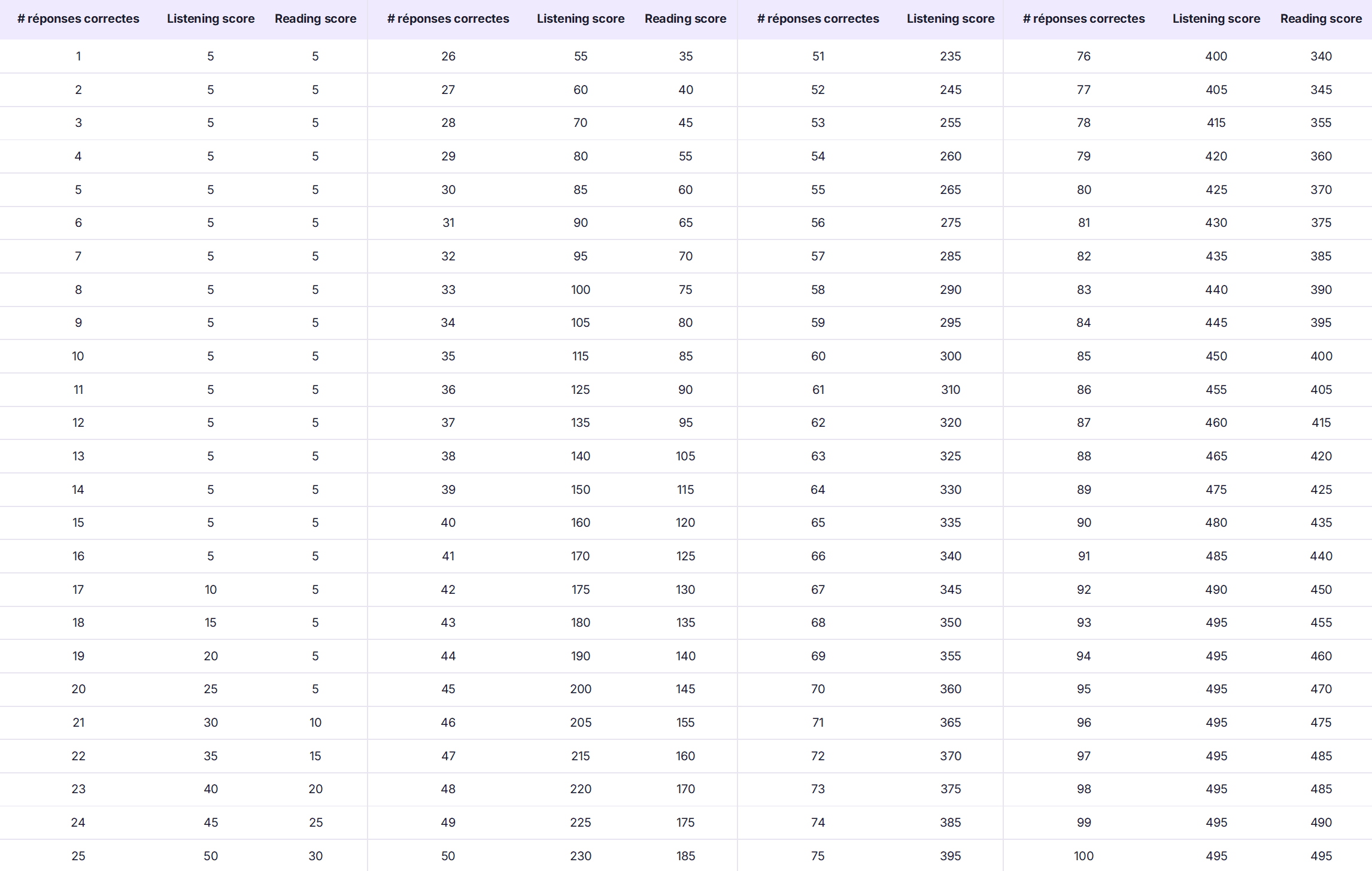 Table de conversion : bonnes réponses → score par section